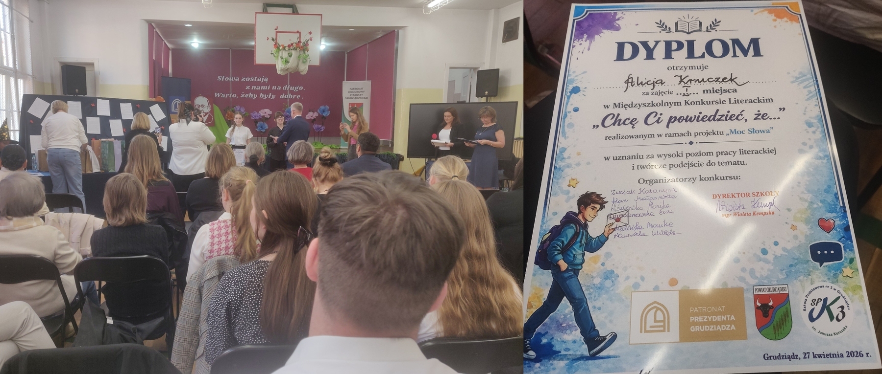 W kolejnym roku szkolnym odnotowaliśmy swój sukces na etapie wojewódzkim Konkursu Przedmiotowego z Języka Polskiego Kuratora Oświaty w Bydgoszczy. W sobotę,14 marca 2026 r., dwie uczennice naszej szkoły: Marta Makowska i Zofia Pylak z kl. VIII wzięły udział w konkursie, pisząc rozprawkę na wybrany temat i odpowiadając na 2 pytania etapu ustnego. Obie uczestniczki uzyskały tytuły finalistek, plasując się wysoko w hierarchii wyników procentowych. Sobotni sukces wymagał przeczytania dodatkowych lektur, m.in. powieści „Krzyżacy” Henryka Sienkiewicza, z którego to utworu dziewczyny wylosowały pytania w części ustnej. Drugie z pytań sprawdzało opanowanie wiadomości i umiejętności z gramatyki i ortografii.
